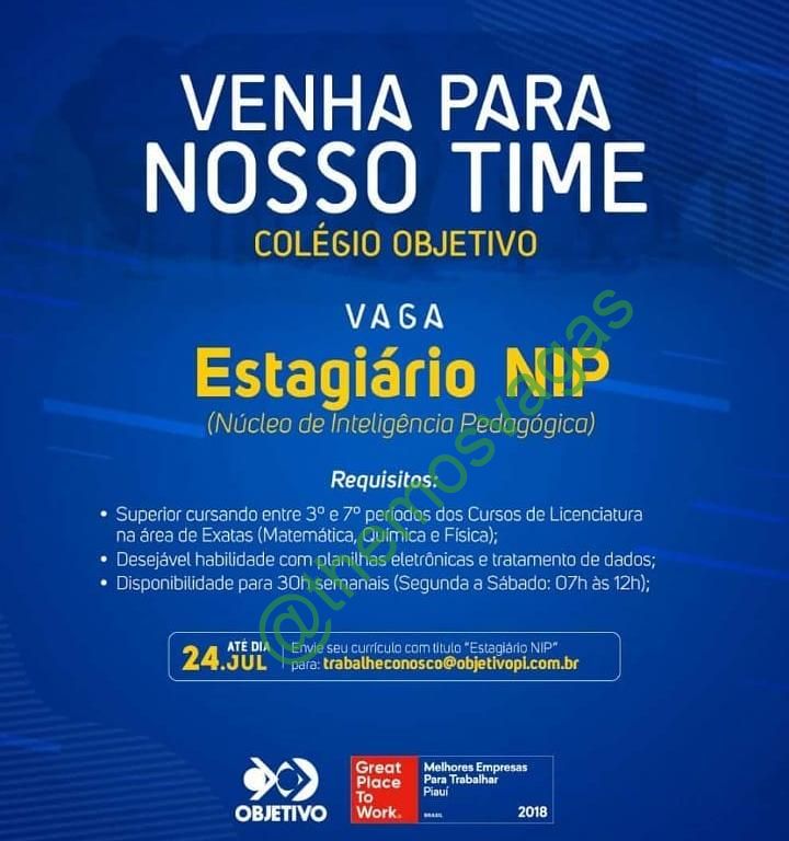 – Interessados(as) e que atendam ao perfil solicitado acima, devem enviar o currículo até 26/07/2019 para o e-mail trabalheconosco@objetivopi.com.br contendo no título/assunto “Estagiário NIP“.