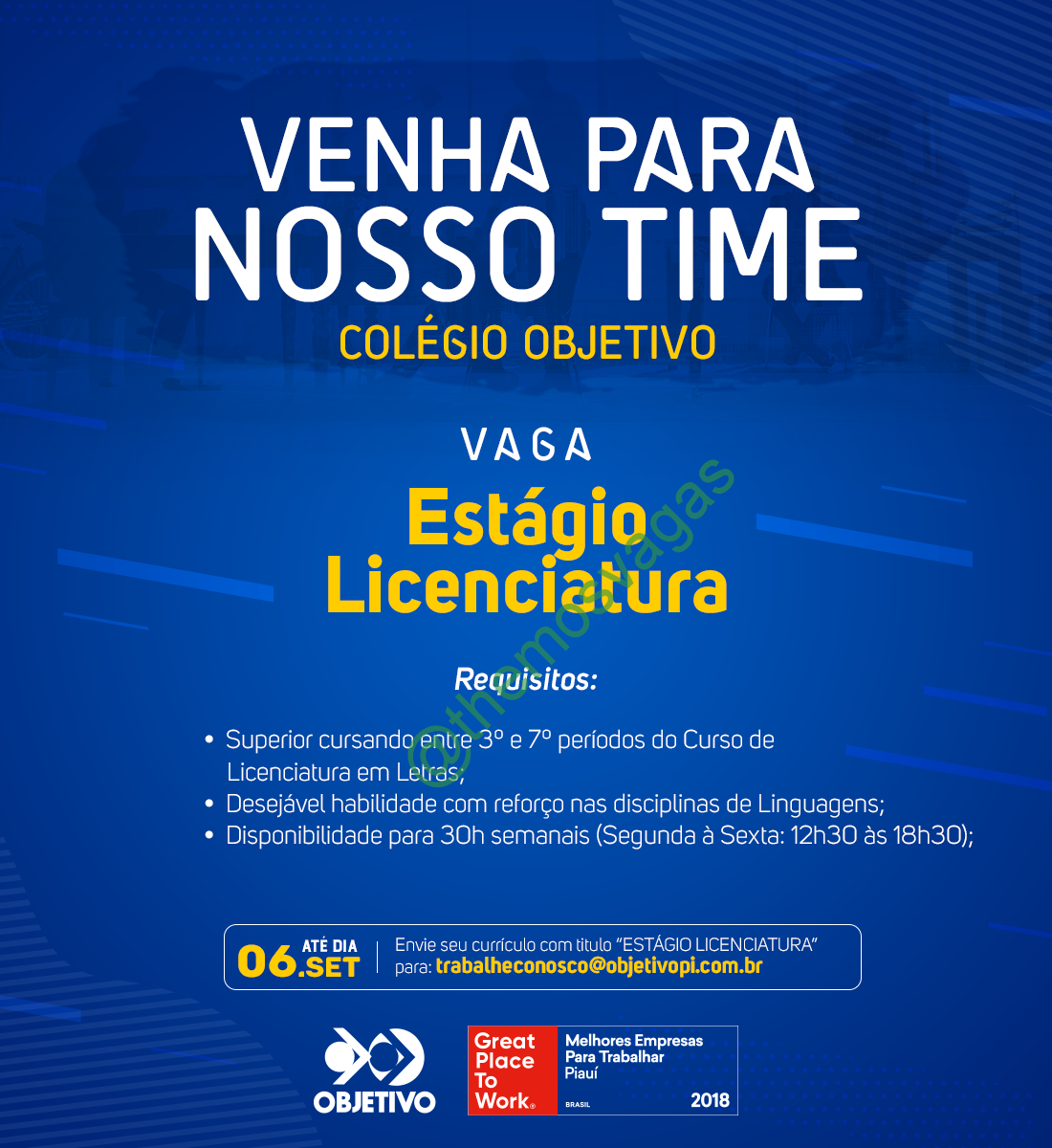 – Interessados(as) e que atendam ao perfil solicitado acima, devem enviar o currículo até 06/09/2019 para o e-mail trabalheconosco@objetivopi.com.br contendo no título/assunto “Estágio  Licenciatura“.
