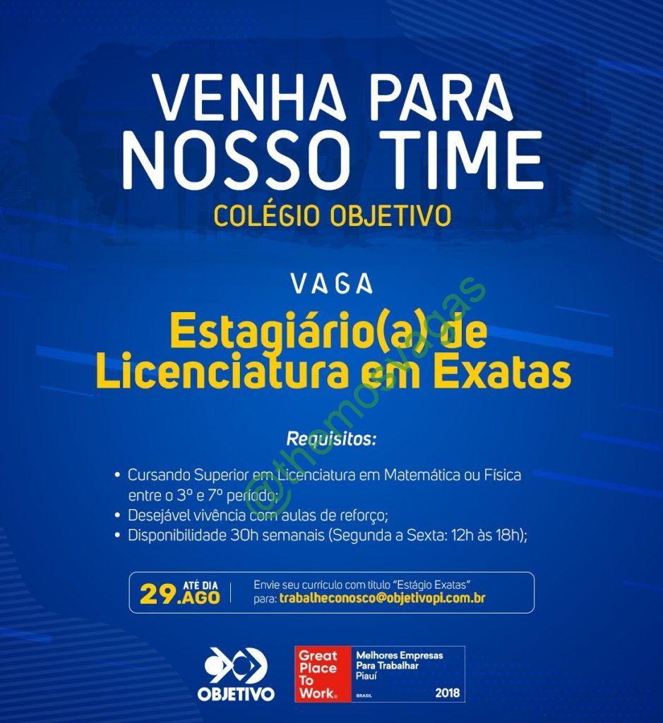– Interessados(as) e que atendam ao perfil solicitado acima, devem enviar o currículo até 29/09/2019 para o e-mail trabalheconosco@objetivopi.com.br contendo no título/assunto “Estágio  Exatas”.