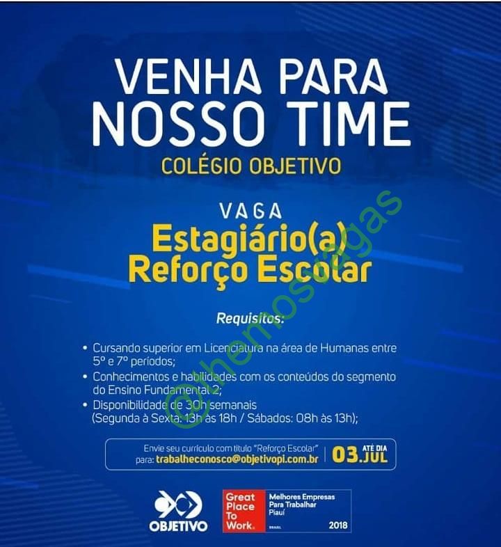 – Interessados(as) e que atendam aos requisitos devem enviar o perfil profissional até o dia 03/07/2019, colocando no título do e-mail “Reforço Escolar”, para:  trabalheconosco@objetivopi.com.br