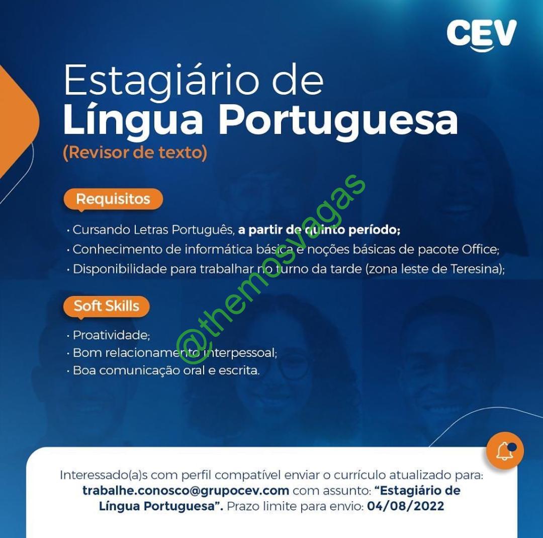 – Interessados(as) e que atendam ao perfil solicitado acima, devem enviar o currículo até 04/08/2022 para o e-mail trabalhe.conosco@grupocev.com contendo no título/assunto “Estagiário Língua Portuguesa”