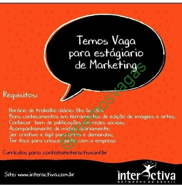 – Interessados(as) e que atendam ao perfil solicitado acima, devem enviar o currículo para o e-mail contato@interactiva.inf.br , colocando no título “Estágio de Marketing”.