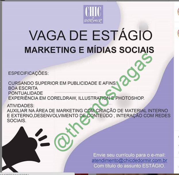 – Interessados(as) e que atendam ao perfil solicitado acima, devem enviar o currículo para o e-mail atendimento@chicdedormir.com.br , colocando no título “Estágio de Marketing”.