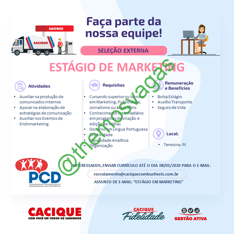 – Interessados(as) e que atendam ao perfil solicitado acima, devem enviar o currículo para o e-mail recrutamento@caciquecombustiveis.com.br , colocando no título/assunto: “Estágio de Marketing”.