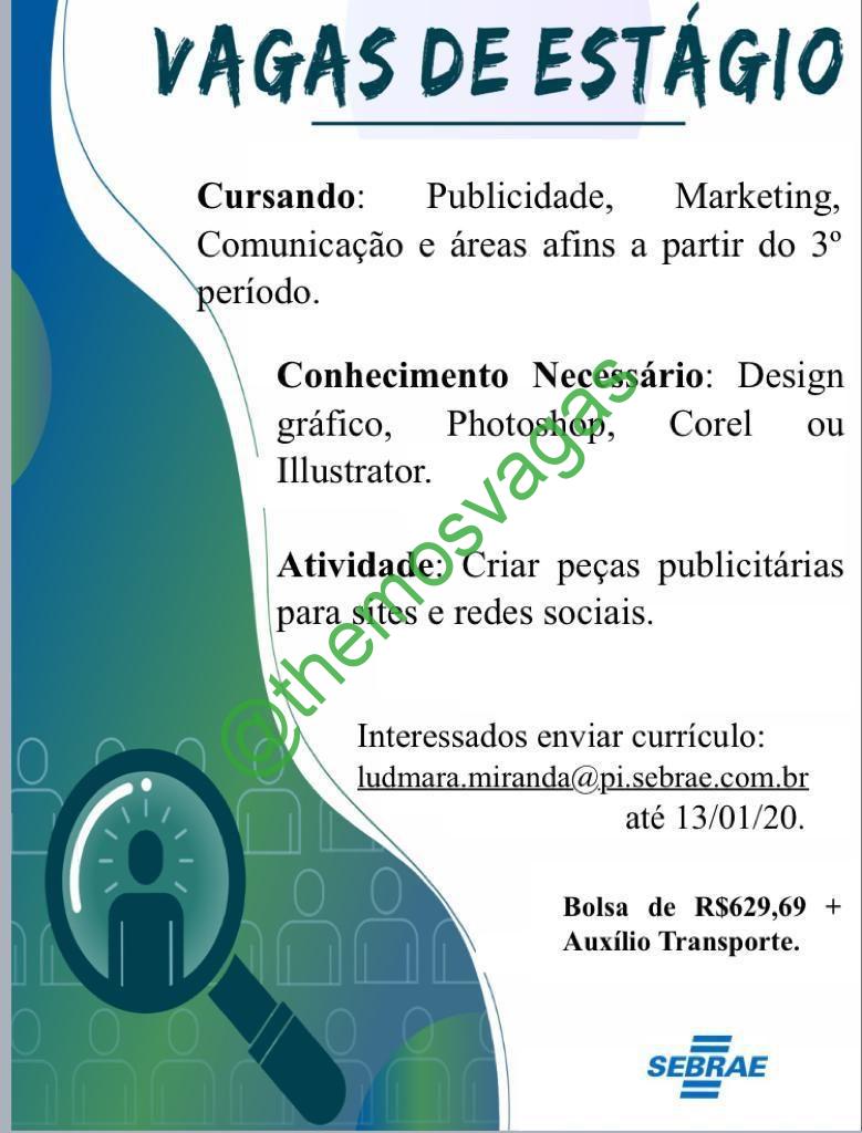 – Interessados(as) e que atendam ao perfil solicitado acima, devem enviar o currículo até 13/01/2020 para o e-mail ludmara.miranda@pi.sebrae.com.br contendo no título/assunto “Estágio de Marketing THE