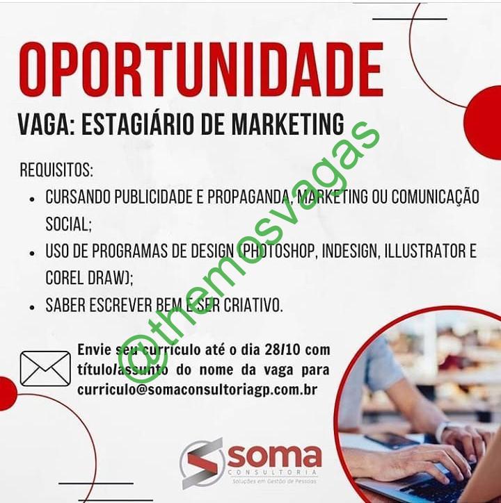 – Interessados(as) e que atendam ao perfil solicitado acima, devem enviar o currículo até 28/10/2019 para o e-mail curriculo@somaconsultoriagp.com.br contendo no título/assunto “Estágio de Marketing THE“.