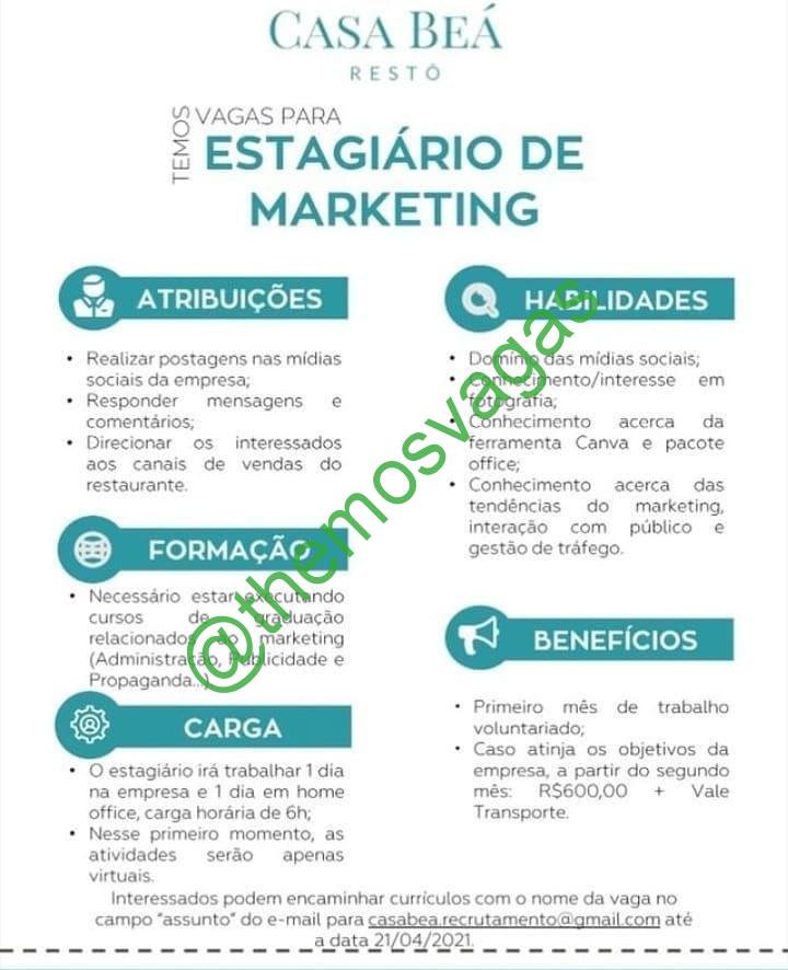 –  Interessados(as) e que atendam ao perfil solicitado acima, devem enviar o currículo até 21/04/2021 para o e-mail casabea.recrutamento@gmail.com, contendo no título/assunto “Estágio de Marketing – FOR”.