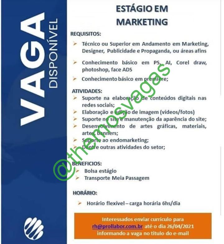 –  Interessados(as) e que atendam ao perfil solicitado acima, devem enviar o currículo até 26/04/2021 para o e-mail rh@prollabor.com.br, contendo no título/assunto “Analista de Marketing – FOR”.