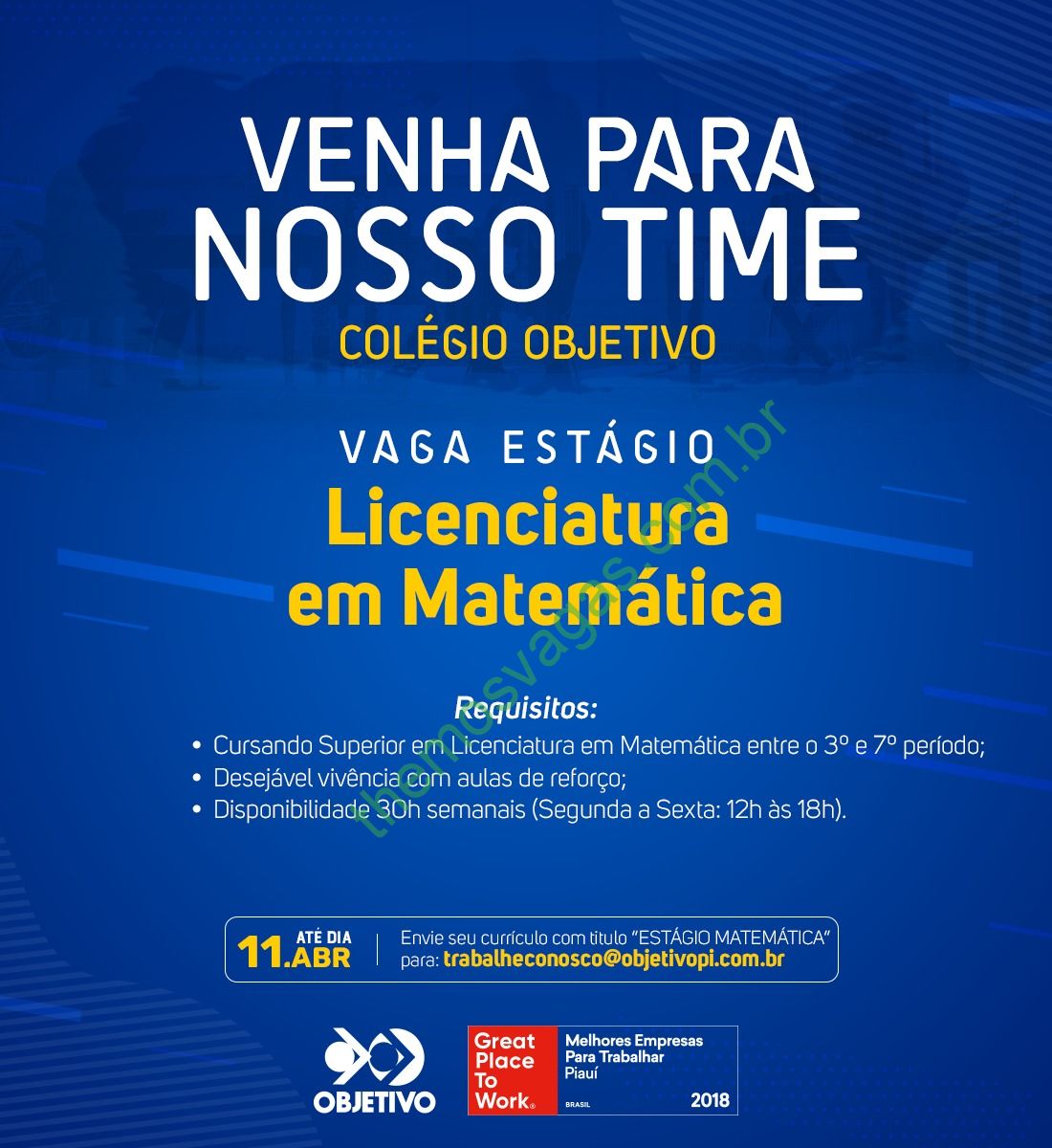 Interessados(as) e que atendam aos requisitos devem enviar o perfil profissional até o dia 11/04/2019, colocando no título do e-mail “Estágio de Matemática”, para: trabalheconosco@objetivopi.com.br