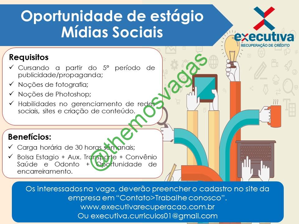 – Interessados(as) e que atendam ao perfil solicitado acima, devem enviar o currículo para o e-mail executiva.curriculos01@gmail.com contendo no título/assunto “Estágio de Mídias Sociais THE“.