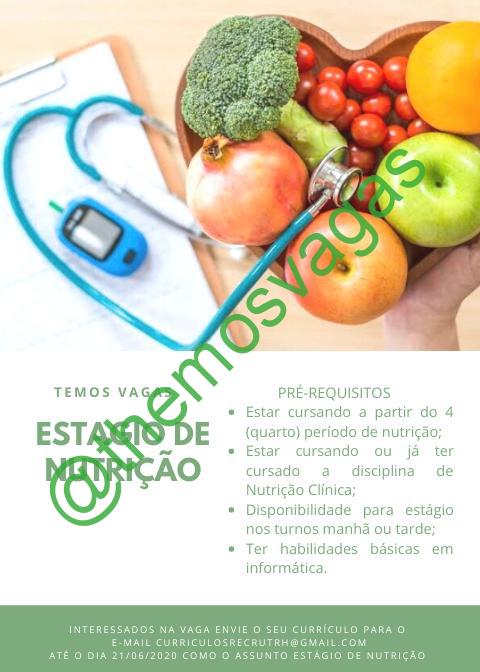 – Interessados(as) e que atendam ao perfil solicitado acima, devem enviar o currículo até 21/06/2020 para o e-mail curriculosrecrutrh@gmail.com contendo no título/assunto “Estágio de Nutrição THE