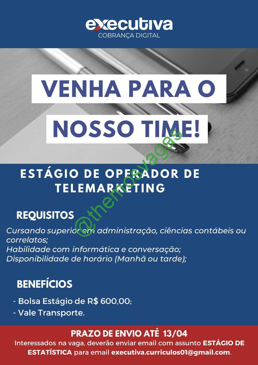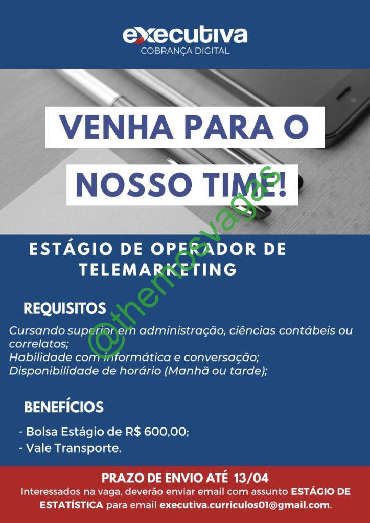 – Interessados(as) e que atendam ao perfil solicitado acima, devem enviar o currículo até 13/04/2022  para o e-mail executiva.curriculos01@gmail.com contendo no título/assunto “Estágio de Operador de Telemarketing