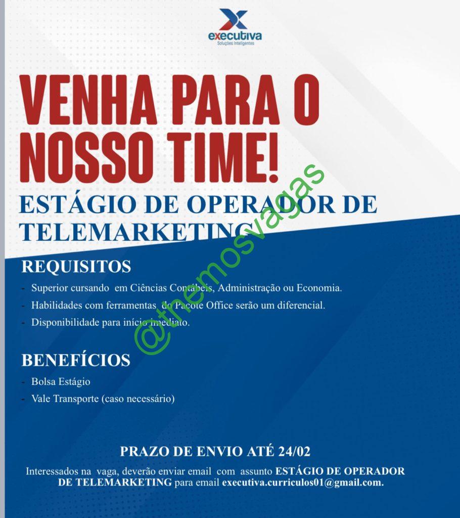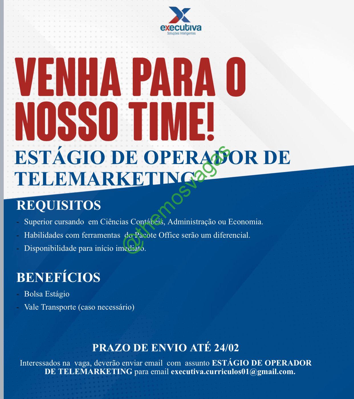 – Interessados(as) e que atendam ao perfil solicitado acima, devem enviar o currículo até 24/02/2022  para o e-mail executiva.curriculos01@gmail.com contendo no título/assunto “Estágio de Operador de Telemarketing
