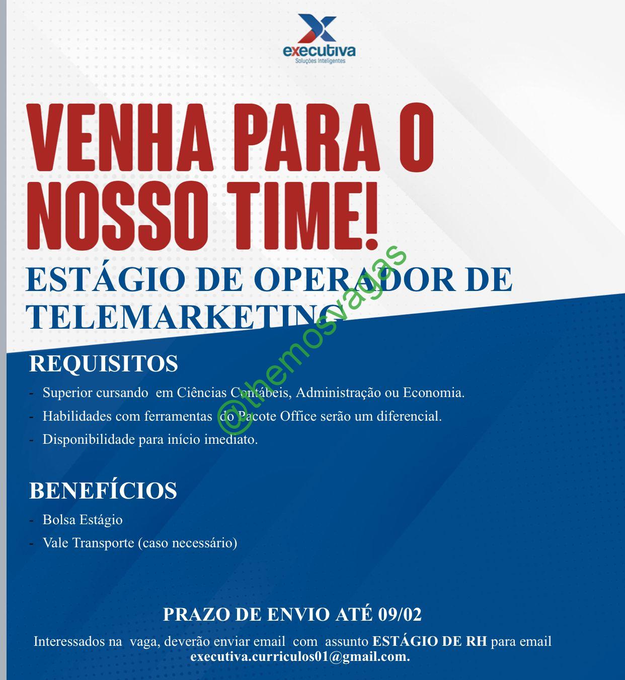 – Interessados(as) e que atendam ao perfil solicitado acima, devem enviar o currículo até 09/02/2022  para o e-mail executiva.curriculos01@gmail.com contendo no título/assunto “Estágio de Operador de Telemarketing