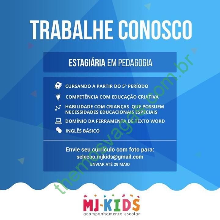 – Interessados(as) e que atendam aos requisitos devem enviar o perfil profissional até o dia 29/05/2019, colocando no título do e-mail “Estágio de Pedagogia”, para: selecao.mjkids@gmail.com