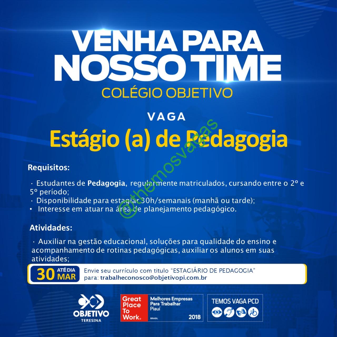– Interessados(as) e que atendam ao perfil solicitado acima, devem enviar o currículo até 30/01/2022  para o e-mail trabalheconosco@objetivopi.com.br contendo no título/assunto “Estagiário de Pedagogia