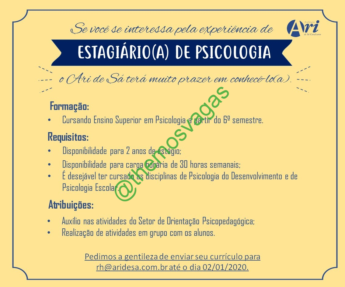 – Interessados(as) e que atendam ao perfil solicitado acima, devem 02/01/2020 enviar o currículo para o e-mail rh@aridesa.com.br , colocando no título “Estágio em Psicologia”.