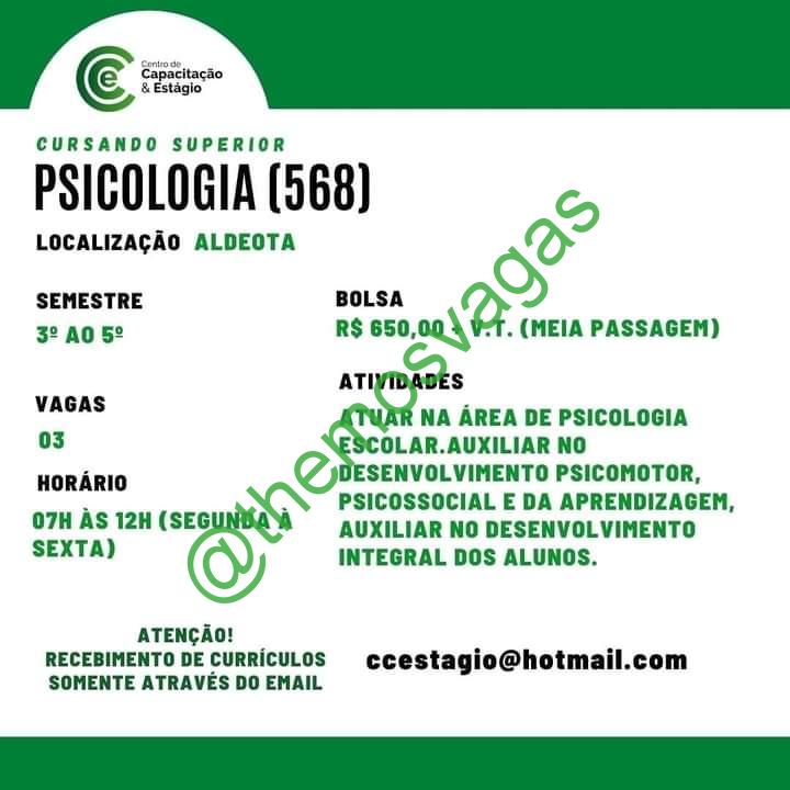 – Interessados(as) e que atendam ao perfil solicitado acima, devem enviar o currículo para o e-mail ccestagio@hotmail.com contendo no título/assunto “Estágio de Psicologia – FOR“.