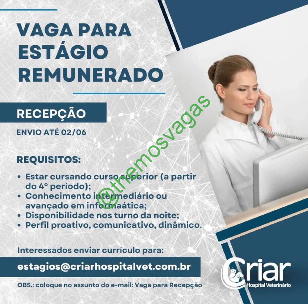 – Interessados(as) e que atendam ao perfil solicitado acima, devem enviar o currículo até 02/06/2023 para o e-mail estagios@criarhospitalvet.com.br contendo no título/assunto “Vaga para Recepção“.