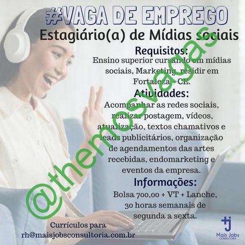 – Interessados(as) e que atendam ao perfil solicitado acima, devem enviar o currículo para o e-mail rh@maisjobsconsultoria.com.br contendo no título/assunto “Estágio de Social Media – FOR“.