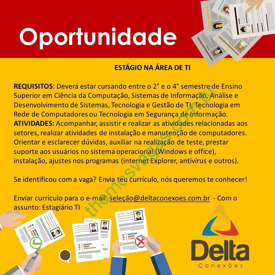 – Interessados(as) e que atendam ao perfil solicitado acima, devem enviar o currículo para o e-mail selecao@deltaconexoes.com.br , colocando no título “Estágio de TI”.