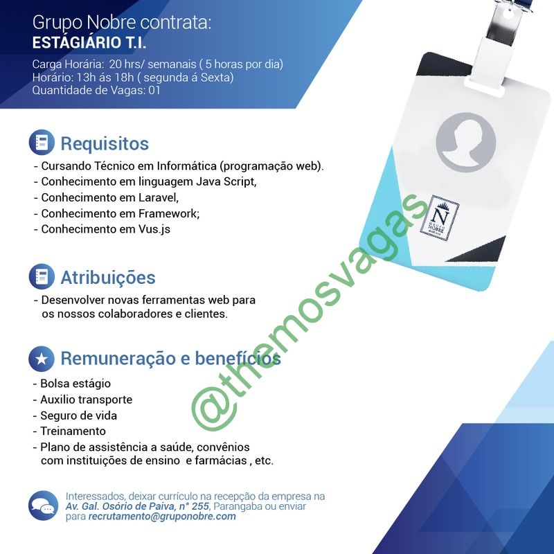 – Interessados(as) e que atendam ao perfil solicitado acima, devem enviar o currículo para o e-mail recrutamento@gruponobre.com , colocando no título “Estágio de T.I”.
