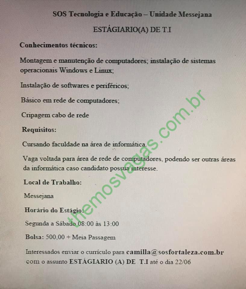– Interessados(as) e que atendam ao perfil solicitado acima, devem enviar o currículo para o e-mail camilla@sosfortaleza.com.br até o dia 22/06/2019 , colocando no título “Esgiário(a) de T.I.”.
