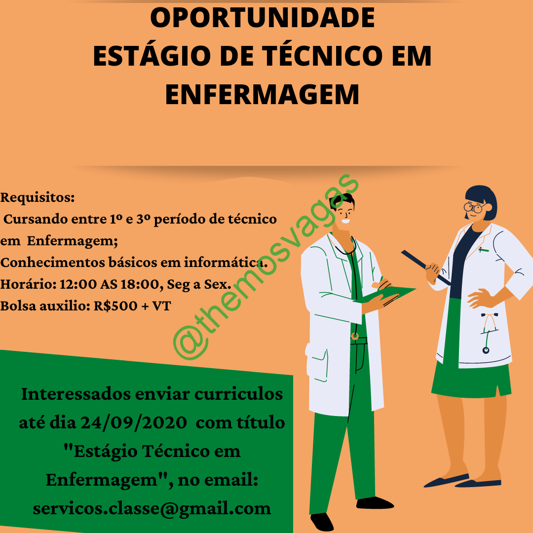 – Interessados(as) e que atendam ao perfil solicitado acima, devem enviar o currículo até 24/09/2020 para o e-mail servicos.classe@gmail.com contendo no título/assunto “Estágio de Tec em Enfermagem THE