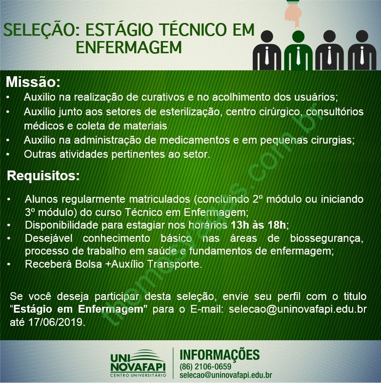 – Interessados(as) e que atendam aos requisitos devem enviar o perfil profissional até o dia 17/06/2019, colocando no título do e-mail “Estágio de Técnico em Enfermagem”, para:  selecao@uninovafapi.edu.br