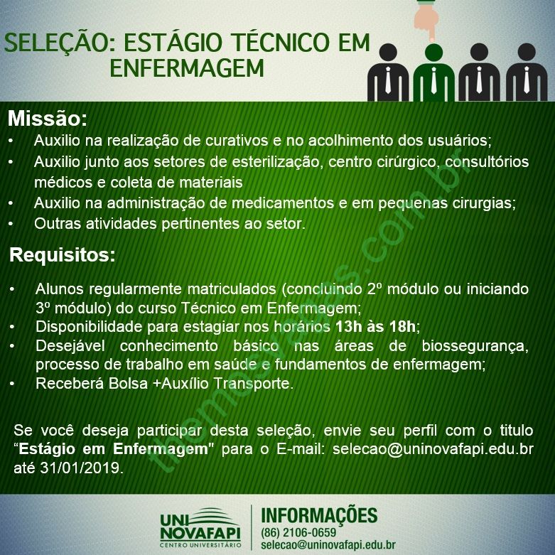 Interessados(as) e que atendam aos requisitos devem enviar o perfil profissional até o dia 31/01/2019, colocando no título do e-mail “Estágio em Enfermagem”, para: selecao@uninovafapi.edu.br