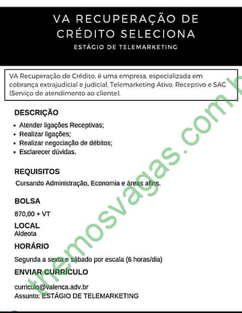 – Interessados(as) e que atendam ao perfil solicitado acima, devem enviar o currículo para o e-mail curriculo@valenca.adv.br colocando no título “Estágio de Telemarketing”.