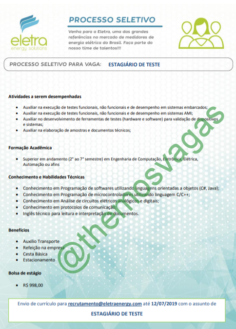 – Interessados(as) e que atendam ao perfil solicitado acima, devem enviar o currículo para o e-mail recrutamento@eletraenergy.com , colocando no título “Estagiário de Teste”.
