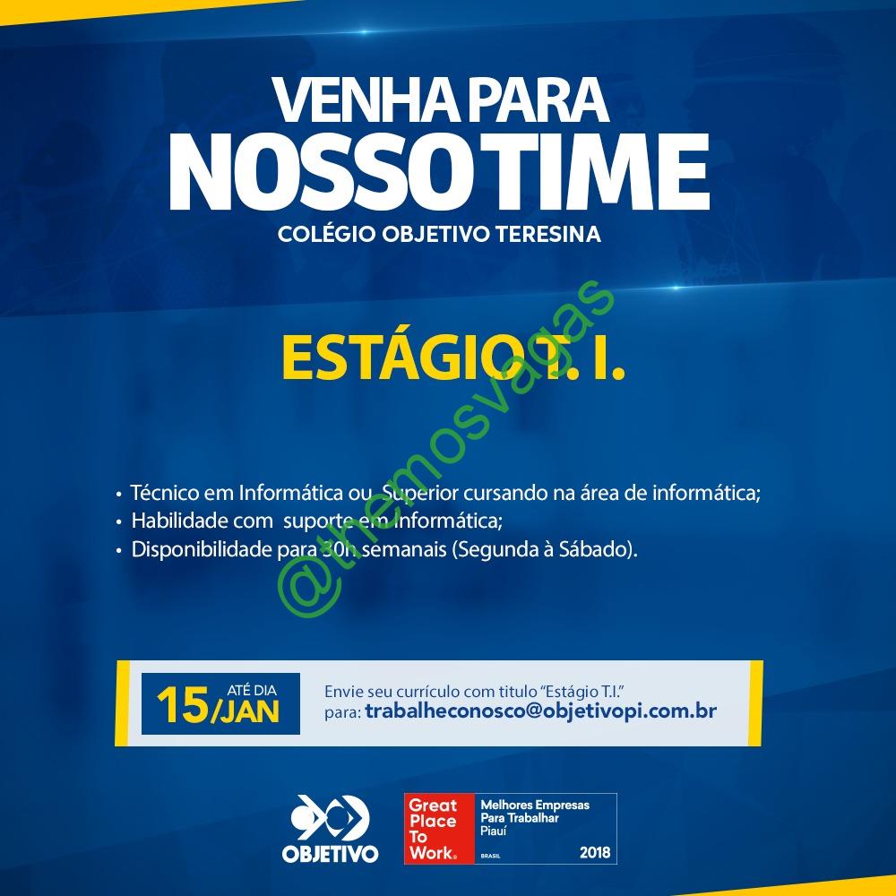 – Interessados(as) e que atendam ao perfil solicitado acima, devem enviar o currículo até 15/01/2020 para o e-mail trabalheconosco@objetivopi.com.br , colocando no título/assunto: “Estágio de TI”.
