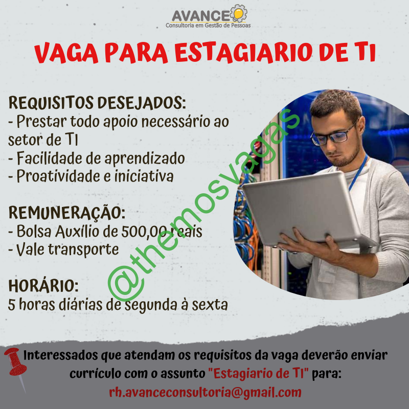 – Interessados(as) e que atendam ao perfil solicitado acima, devem enviar o currículo até /08/2020 para o e-mail rh.avanceconsultoria@gmail.com contendo no título/assunto “Estagiario de TI