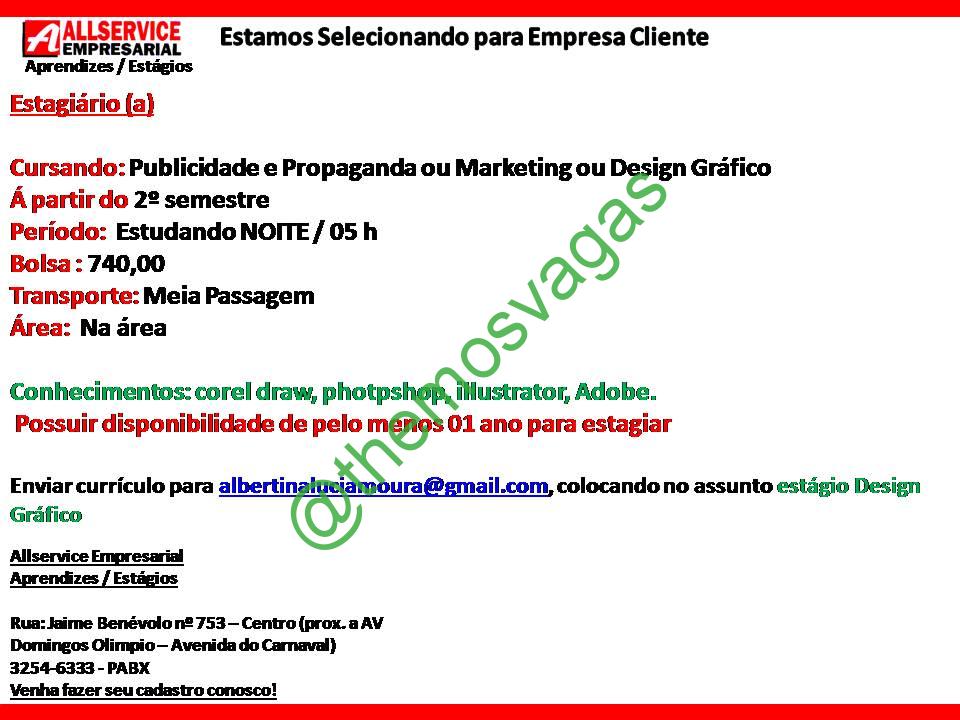 -Interessados e que estejam de acordo com o perfil acima, enviar o currículo albertinaluciamoura@gmail.com com o titulo/assunto “Estagio Design Gráfico – FOR