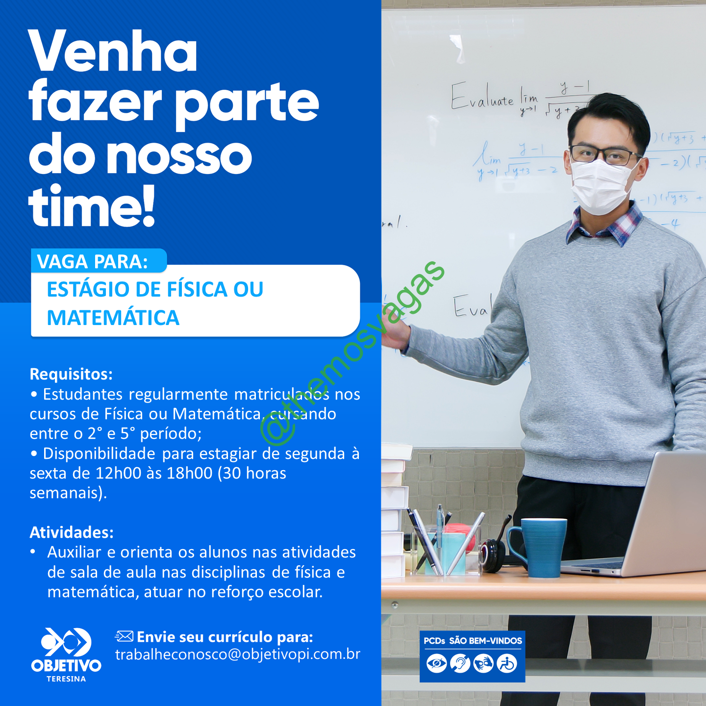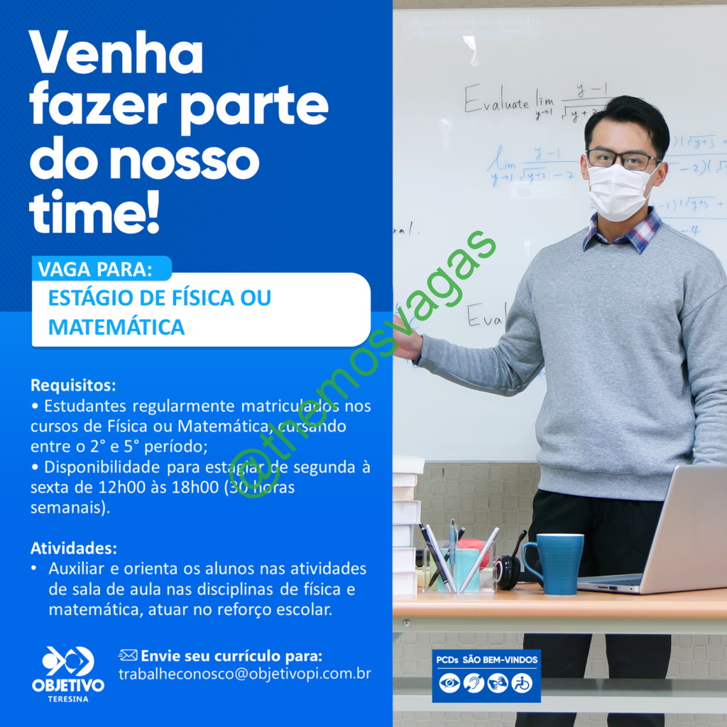 – Interessados(as) e que atendam ao perfil solicitado acima, devem enviar o currículo para o e-mail trabalheconosco@objetivopi.com.br contendo no título/assunto “Estágio Educacional Exatas