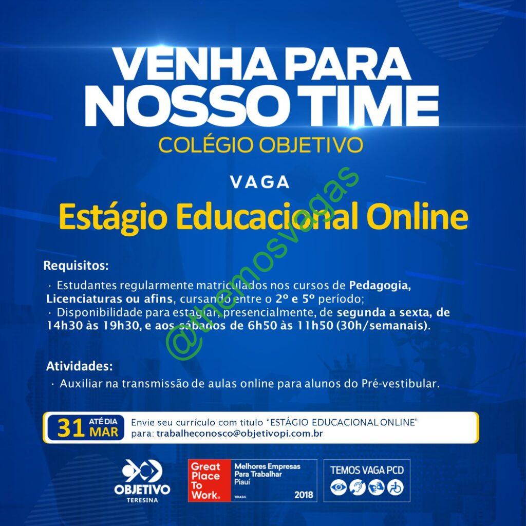 – Interessados(as) e que atendam ao perfil solicitado acima, devem enviar o currículo até 31/03/2022 para o e-mail trabalheconosco@objetivopi.com.br contendo no título/assunto “Estágio Educacional On-line“.