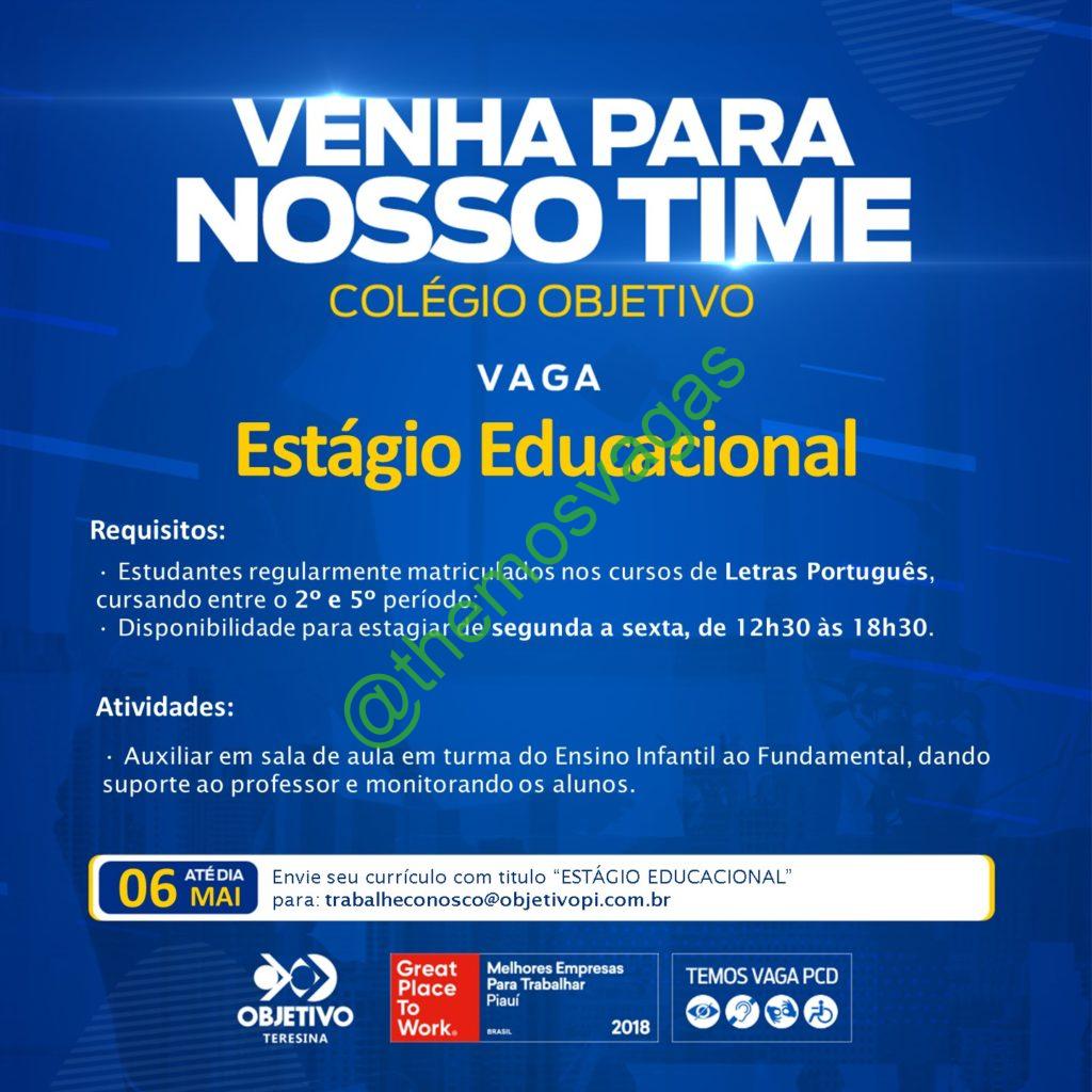 – Interessados(as) e que atendam ao perfil solicitado acima, devem enviar o currículo até 06/05/2022  para o e-mail trabalheconosco@objetivopi.com.br contendo no título/assunto “Estágio Educacional