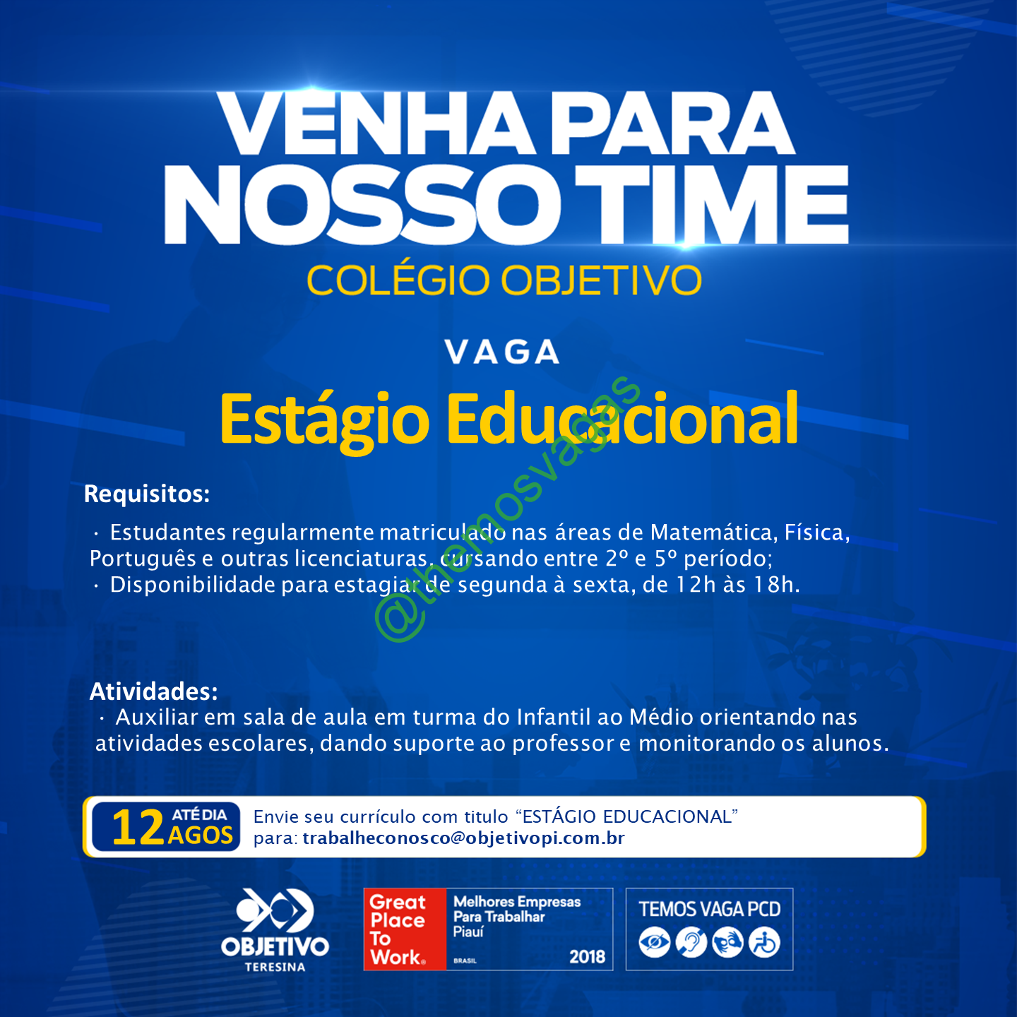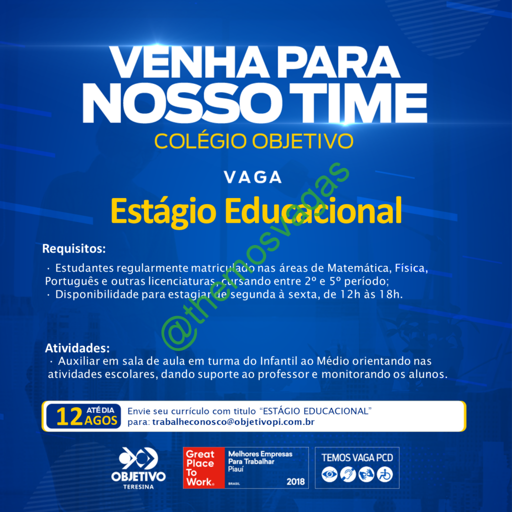 – Interessados(as) e que atendam ao perfil solicitado acima, devem enviar o currículo até 12/08/2022  para o e-mail trabalheconosco@objetivopi.com.br contendo no título/assunto “Estágio Educacional