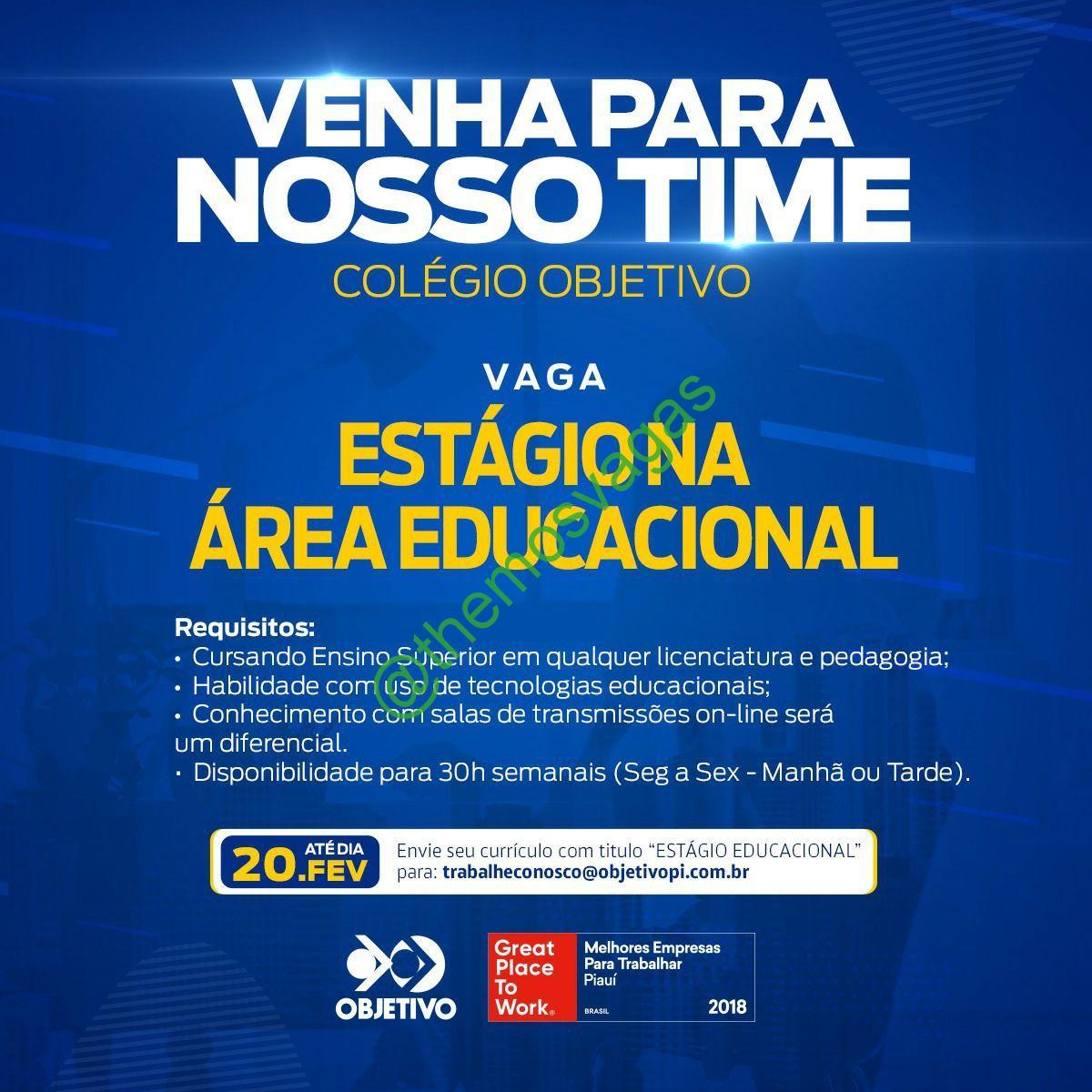 – Interessados(as) e que atendam ao perfil solicitado acima, devem enviar o currículo até 20/02/2021 para o e-mail trabalheconosco@objetivopi.com.br contendo no título/assunto “Estágio Educacional  THE
