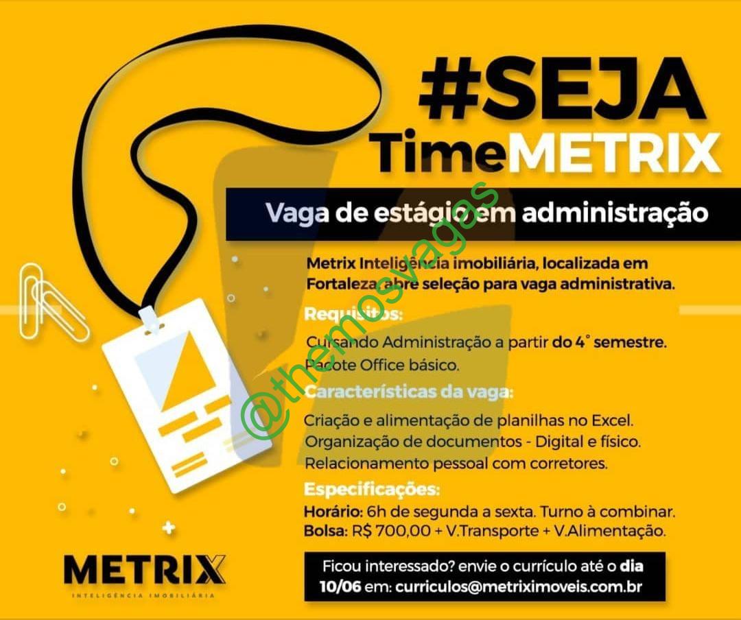 – Interessados(as) e que atendam ao perfil solicitado acima, devem enviar o currículo até 10|06|2021 para o e-mail curriculos@metriximoveis.com.br, contendo no titulo/assunto “Estágio em Administração – FOR