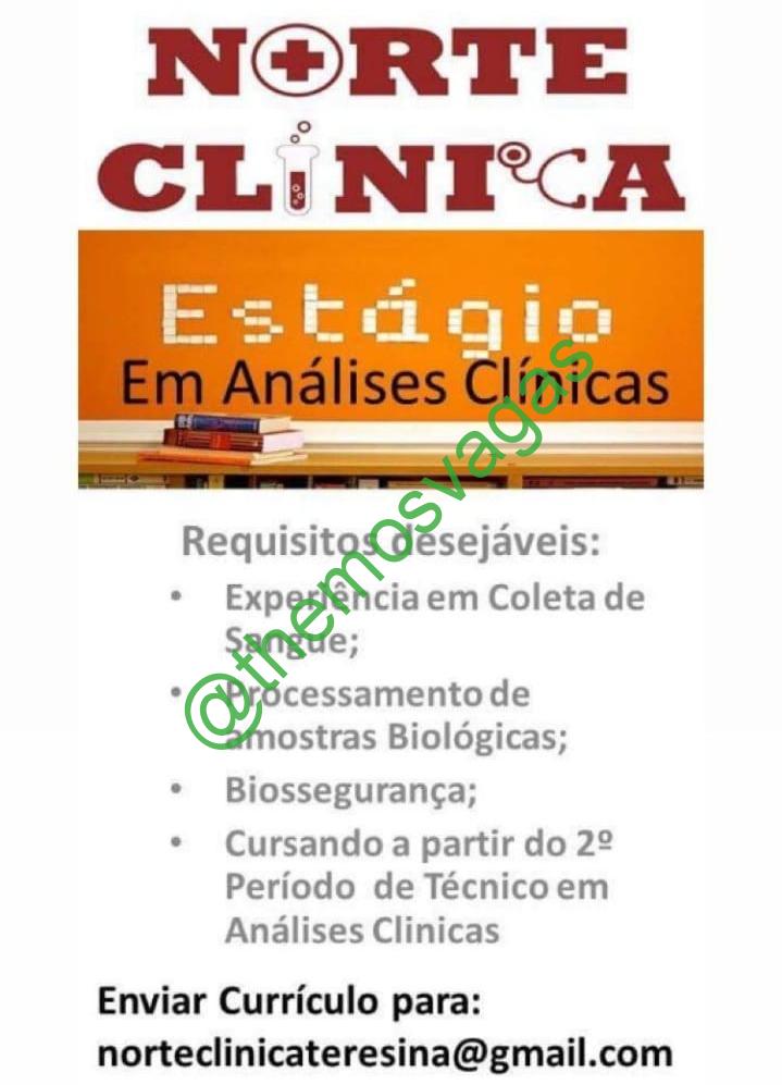 – Interessados(as) e que atendam ao perfil solicitado acima, devem enviar o currículo para o e-mail norteclinicateresina@gmail.com contendo no título/assunto “Estágio em Análises Clinicas THE