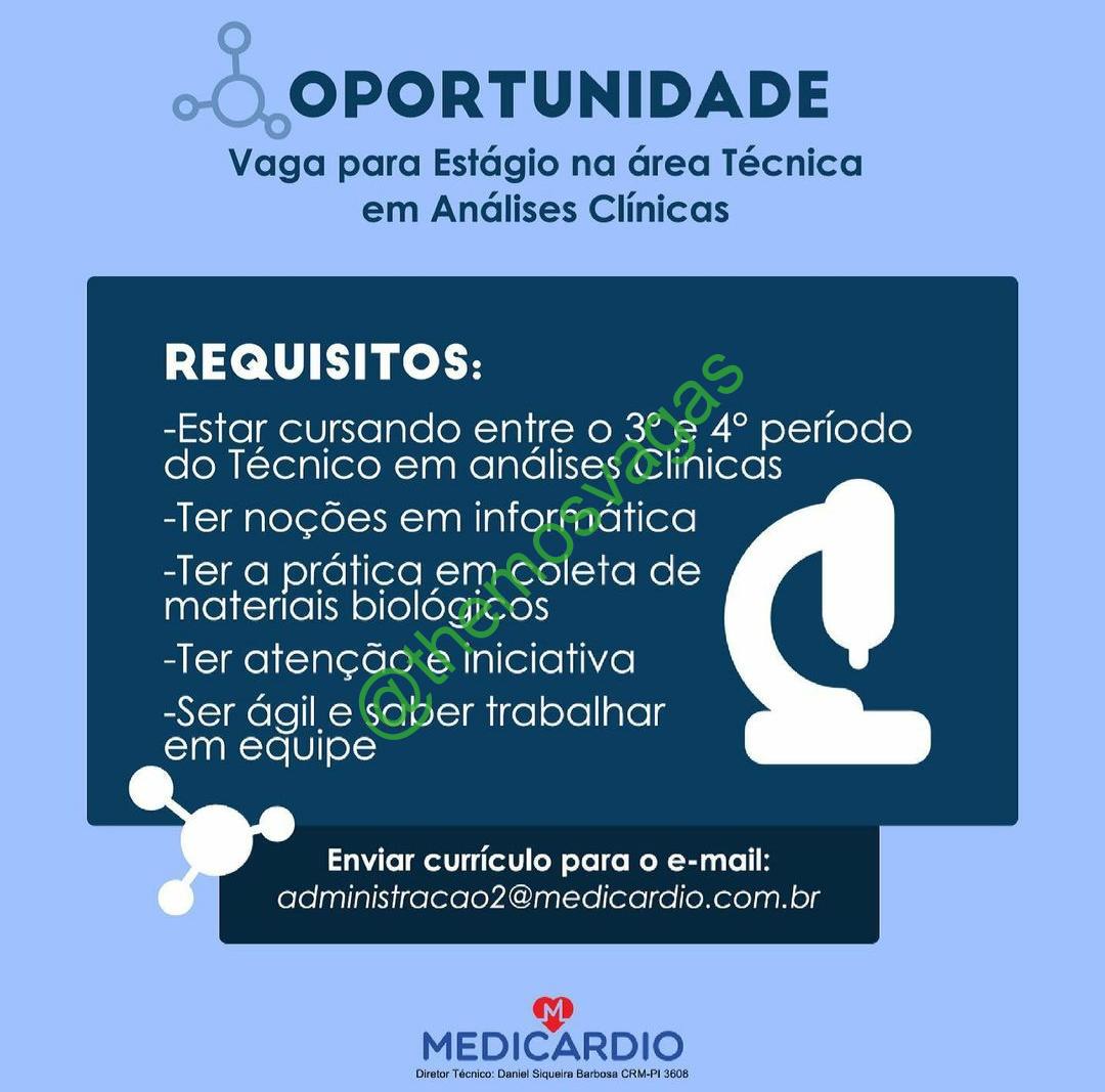 – Interessados(as) e que atendam ao perfil solicitado acima, devem enviar o currículo para o e-mail administracao2@medicardio.com.br contendo no título/assunto “Estágio em Análises Clínicas THE