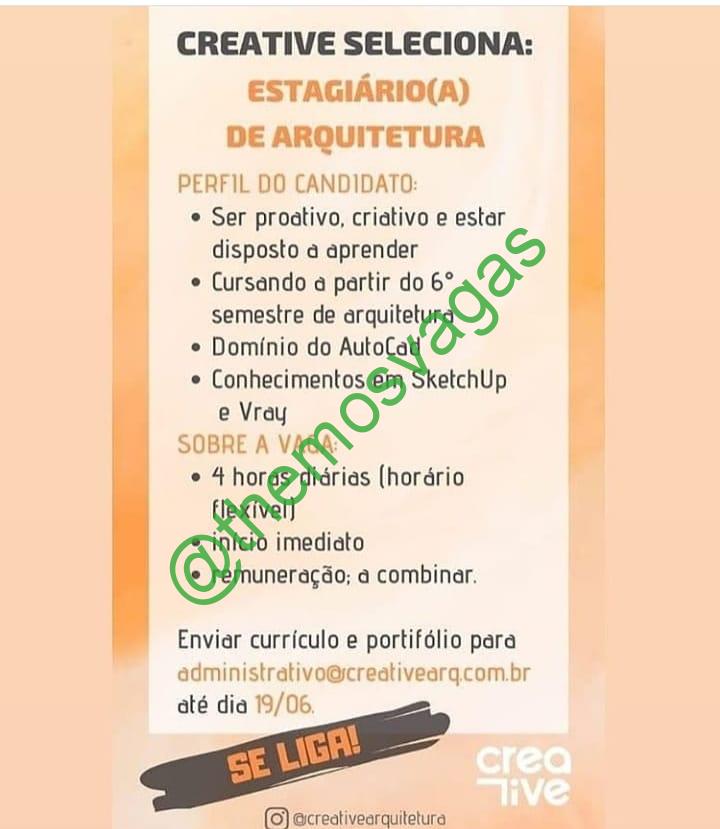 – Interessados(as) e que atendam ao perfil solicitado acima, devem até o dia 19/06/2020 enviar o currículo e portfólio para o e-mail administrativo@creativearq.com.br , colocando no título “Estagiário(a) em Arquitetura”.