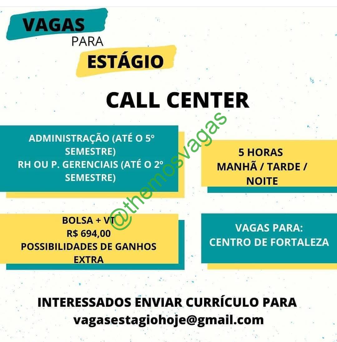 – Interessados(as) e que atendam ao perfil solicitado acima, devem enviar o currículo para o e-mail vagasestagiohoje@gmail.com, contendo no título/assunto “Estágio em Call Center – FOR“.