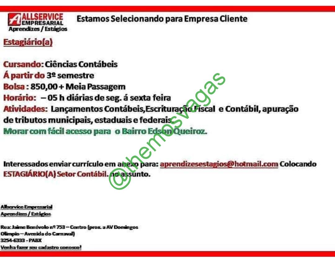 – Interessados(as) e que atendam ao perfil solicitado acima, devem enviar o currículo para o e-mail aprendizestagios@hotmail.com, contendo no título/assunto “Estágio em Ciência Contábeis – FOR“.