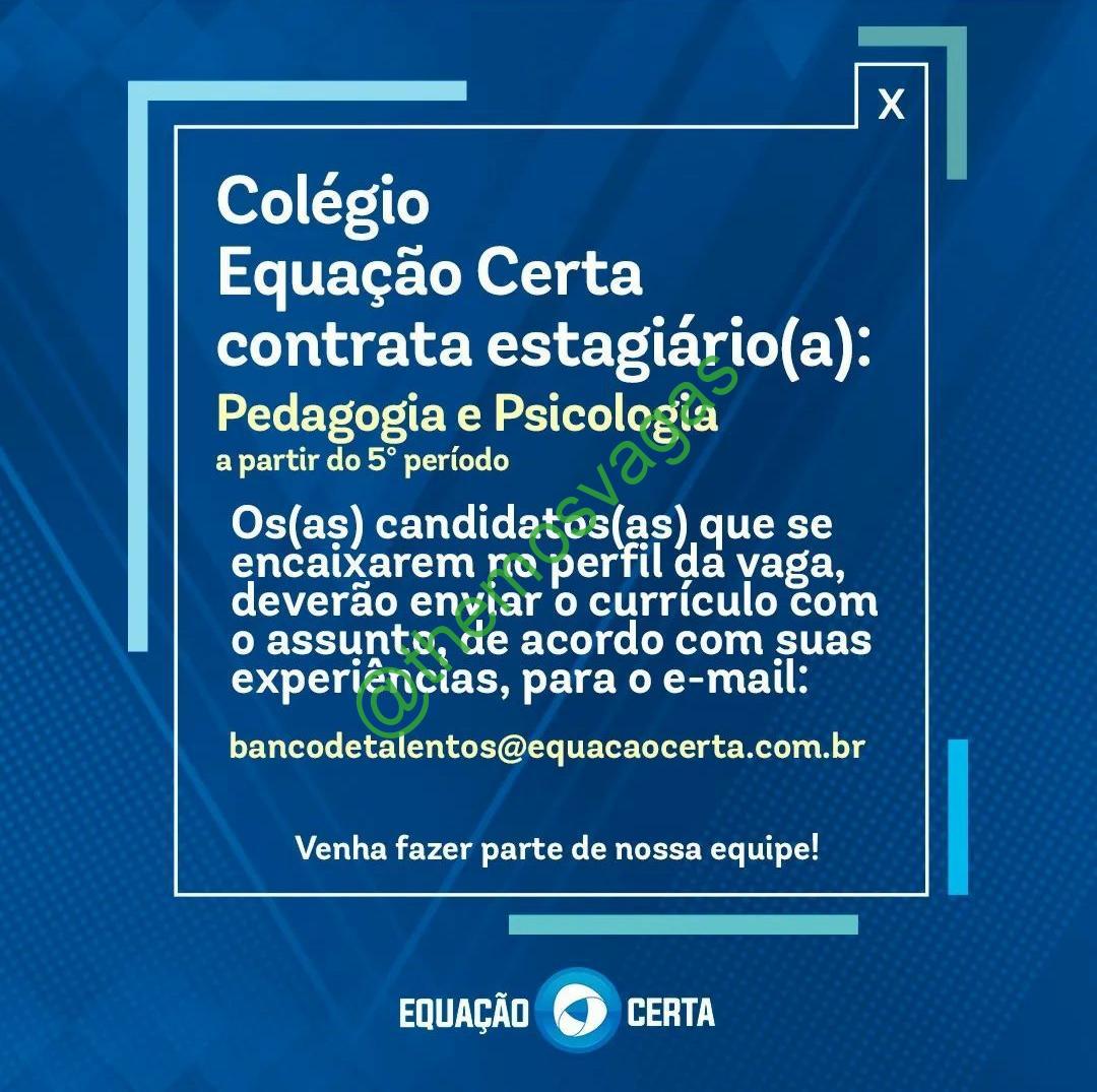 – Interessados(as) e que atendam ao perfil solicitado acima, devem enviar o currículo para o e-mail  bancodetalentos@equacaocerta.com.br contendo no título/assunto “Estágio (Nome da área)