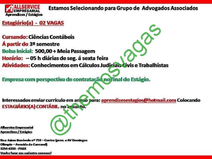 – Interessados(as) e que atendam ao perfil solicitado acima, devem enviar o currículo para o e-mail aprendizesestagio@hotmail.com, contendo no titulo/assunto “Estagiário(a) em Contábeis – FOR