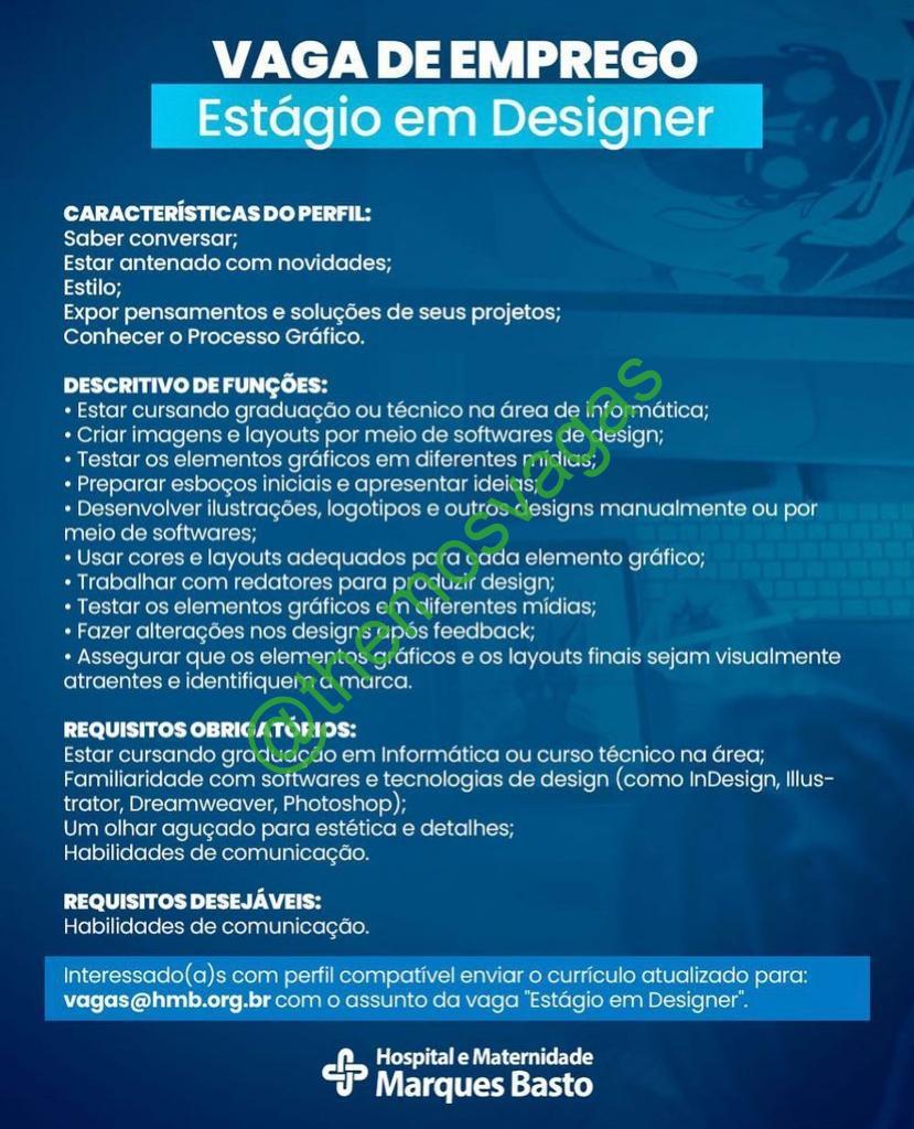 – Interessados(as) e que atendam ao perfil solicitado acima, devem enviar o currículo para o e-mail vagas@hmb.org.br contendo no título/assunto “Estágio em Designer“.