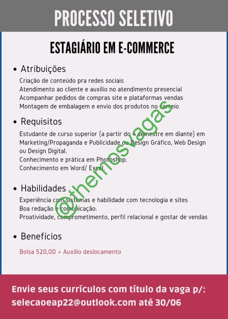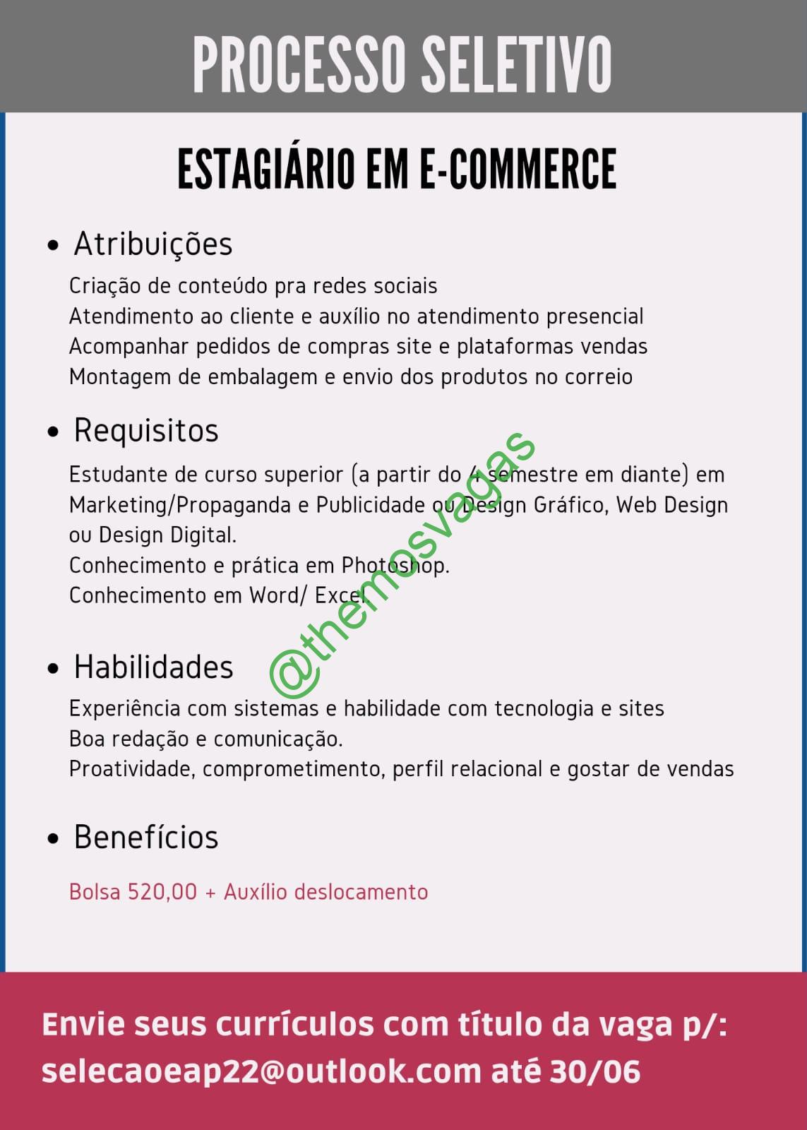 – Interessados(as) e que atendam ao perfil solicitado acima, devem enviar o currículo até 30/06/2022  para o e-mail selecaoeap22@outlook.com contendo no título/assunto “Estágio E-Commerce THE